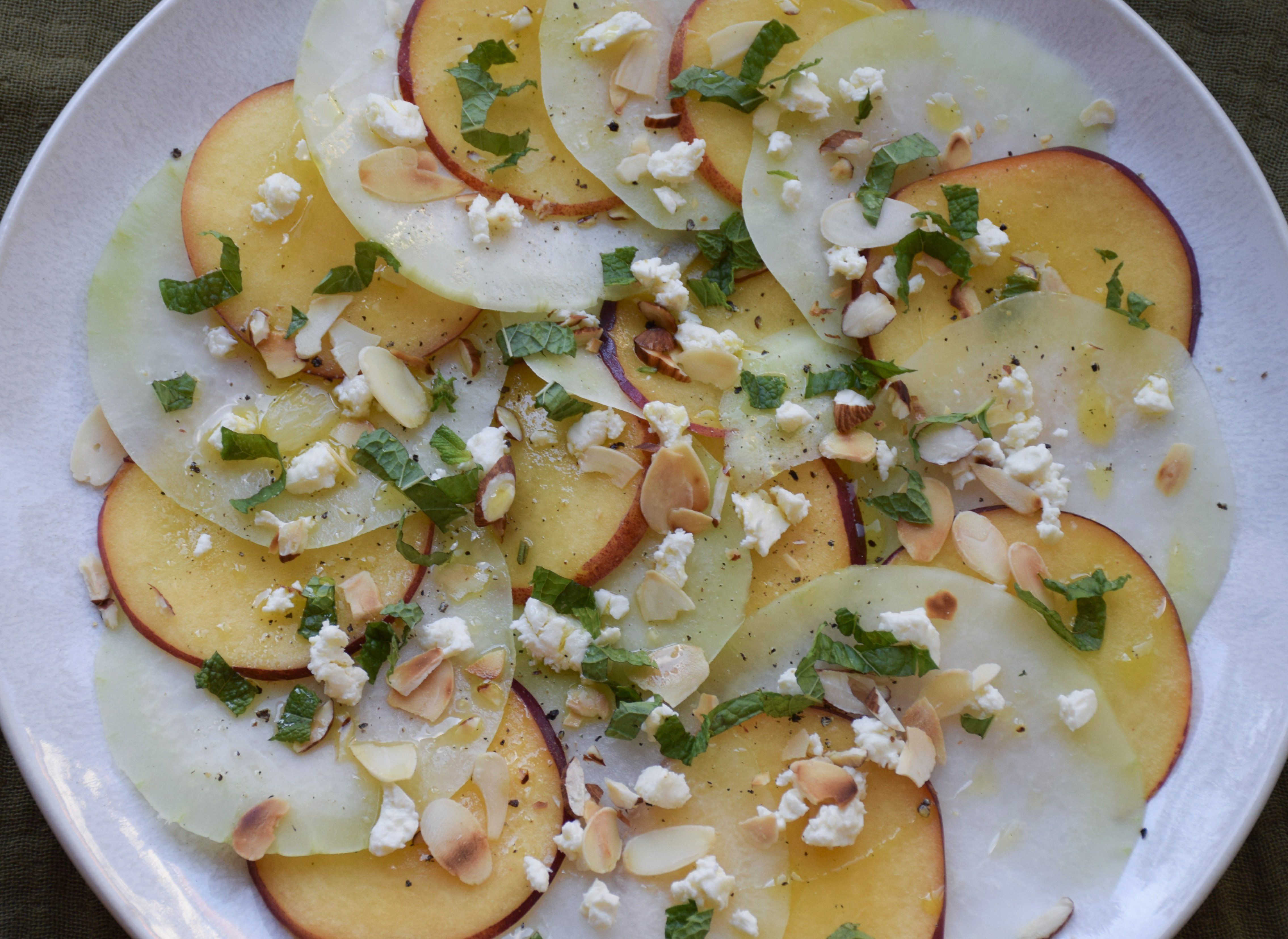 Arrange the kohlrabi and peach slice on a plate, alternating between each layer, and salt & pepper them lightly. Sprinkle the crumpled goat cheese, toasted almonds, and mint on top and mix up a quick vinaigrette, combining the olive oil, mean juice, some salt & pepper to taste. Finish the salad off by slowly pouring some vinaigrette over the salad. Enjoy!