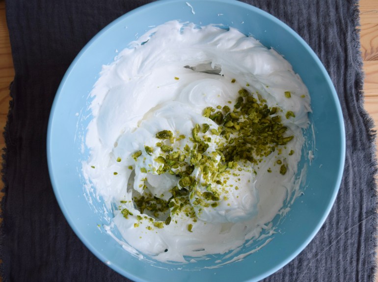 Heat your oven to 120 C fan. Separate the eggs. Add your 4 egg whites and a pinch of salt to your bowl and start whisking with an electric hand whisker/kitchen aid (whatever you have) on medium speed until the egg whites for stiff peaks. Now, continue whisking the whites on the highest speed, adding one tablespoon of sugar at a time until the sugar is gone. Your goal is to have a shiny and smooth mixture that has a perlmutt color. Fold in your chopped pistachios. Take a piping bag (or a freezer bag with one end cut off) and fill in the mixture and slowly pipe little swirls onto a baking sheet, lined with parchment paper. The mixture should make about 10-12 meringues. Bake for 1 hour 15 minutes until the meringues are crisp on the outside, but still a bit bouncy. Take out of the oven to cool. In the meantime, mix your crème fraîche with some vanilla and wash your berries. Arrange the cooled-off meringues, berries, and crème on a plate, potentially sprinkle with mint leaves, and simply eat.