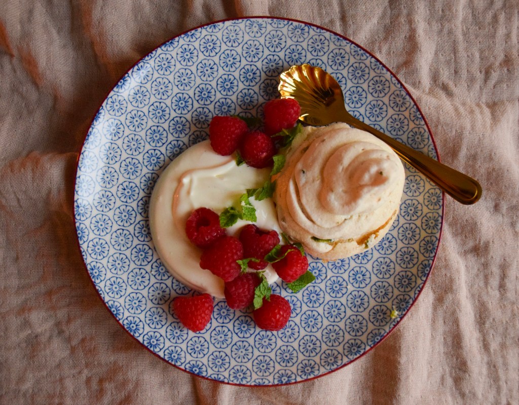 Pistachio Meringues with Crème Fraîche & Raspberries