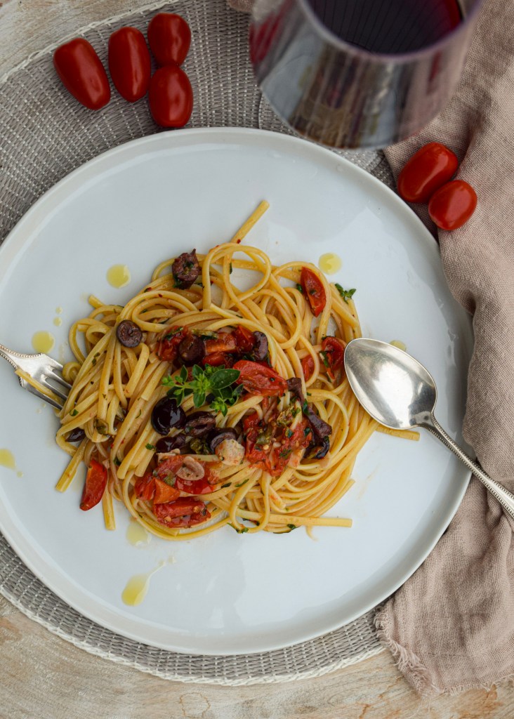 And if you would like to join me in this experience, here comes one of my summer-go to pasta recipes. Summer, because it needs ripe & sweet cherry tomatoes. This secret pasta is almost a spaghetti puttanesca, but without the anchovies and onions. I think this dish is a real jam and I hope you like it too. The recipe is for one person.