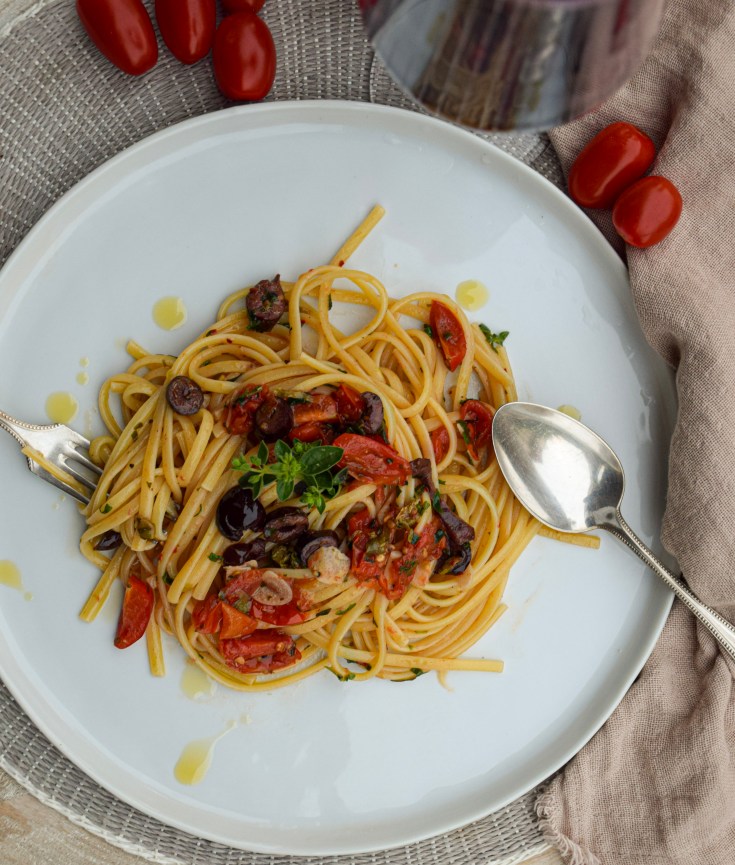 A Course for Life – Summery Peach & Kohlrabi Salad, Linguine Aglio Olio, and Pistachio Meringues with Crème Fraîche & Raspberries